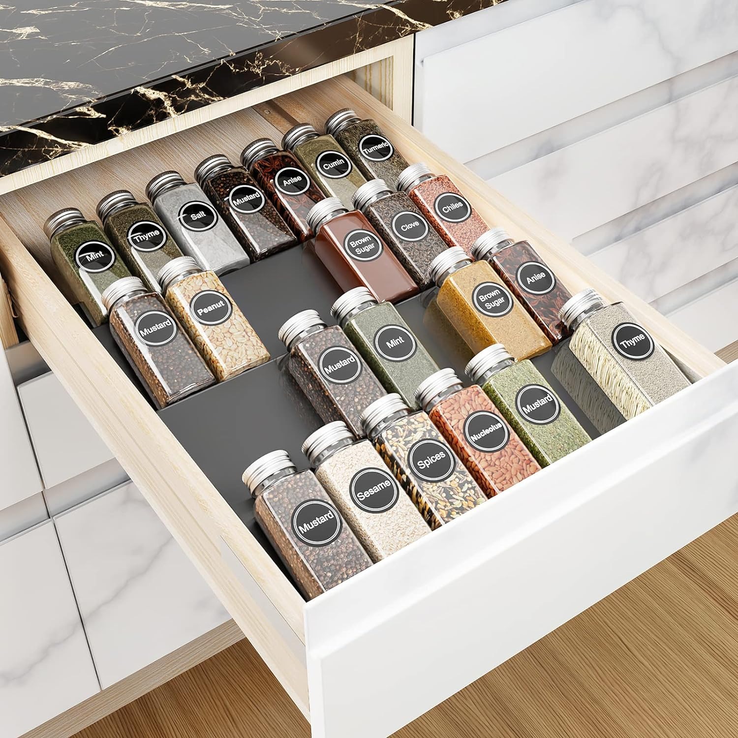 Компактний органайзер для спецій пропонує практичність, оскільки спеції чітко розташовані та не займають багато місця. Розроблений під нахилом, що допомагає легко читати текст етикетки на баночках для спецій і полегшувати їх пошук. Складається з 4 окремих вставок, які можна використовувати разом або окремо, можна комбінувати та підлаштовувати під розмір висувних ящиків. Розмір в см: 42,2 Д x 33,5 Ш x 4,2 В і може вмістити 28 банок для спецій стандартного розміру. Якісний акрил органайзер для спецій виготовлений з високоякісного акрилу, який є міцним, зносостійким, стійким до окислення та довговічним.