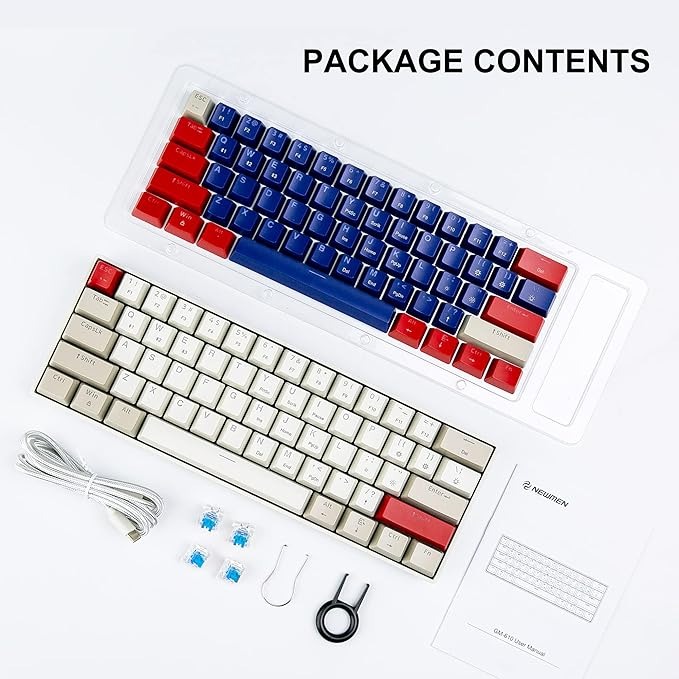 Ця механічна клавіатура на 60% має компактну 61-клавішну розкладку з 61 неконфліктною клавішею (N-клавіша перекидання). Клавіатура NEWMEN GM610 становить лише 60% від звичайної механічної клавіатури, вона на 100% функціональна. Клавіатура на 60 відсотків підходить для ділових офісних ігор, подорожей і домашнього використання та може допомогти вам заощадити місце на робочому столі.