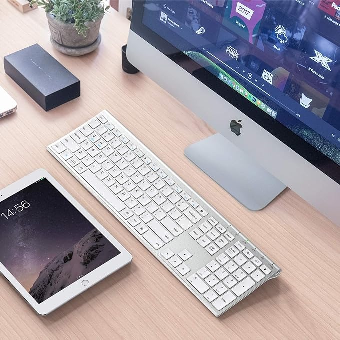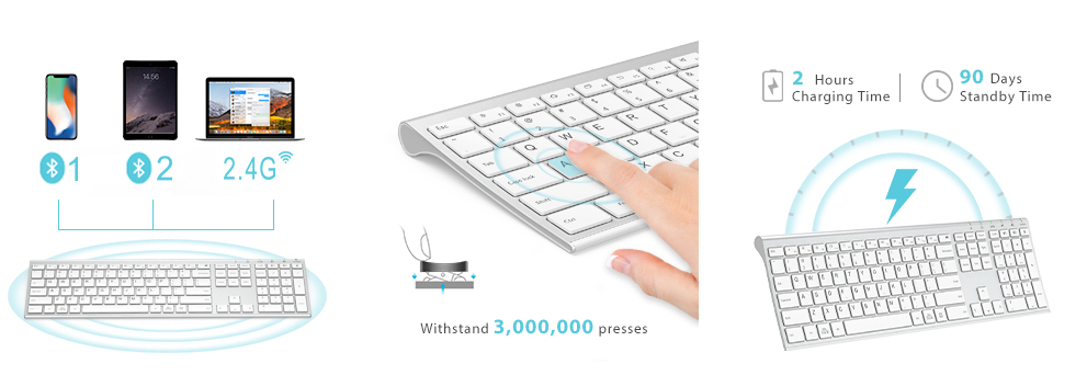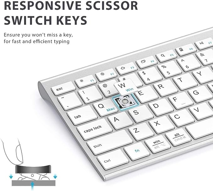 Ця бездротова клавіатура сумісна з усіма основними операційними системами. Ви можете використовувати цю бездротову клавіатуру у Windows, Mac OS, Chrome OS, Android та iOS. Більше того, він може підключатися до двох пристроїв Bluetooth через чіп Bluetooth 4.2 і одного пристрою без Bluetooth за допомогою ключа 2.4G. Незалежно від того, використовуєте клавіатуру з іншими членами сім'ї або виконуєте багатозадачність між різними пристроями, ця клавіатура обов'язково зробить вашу роботу набагато простіше!