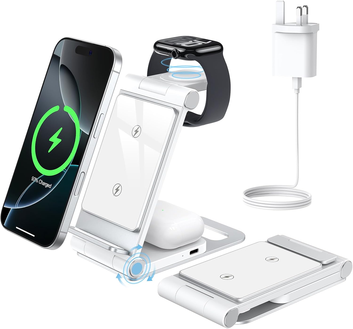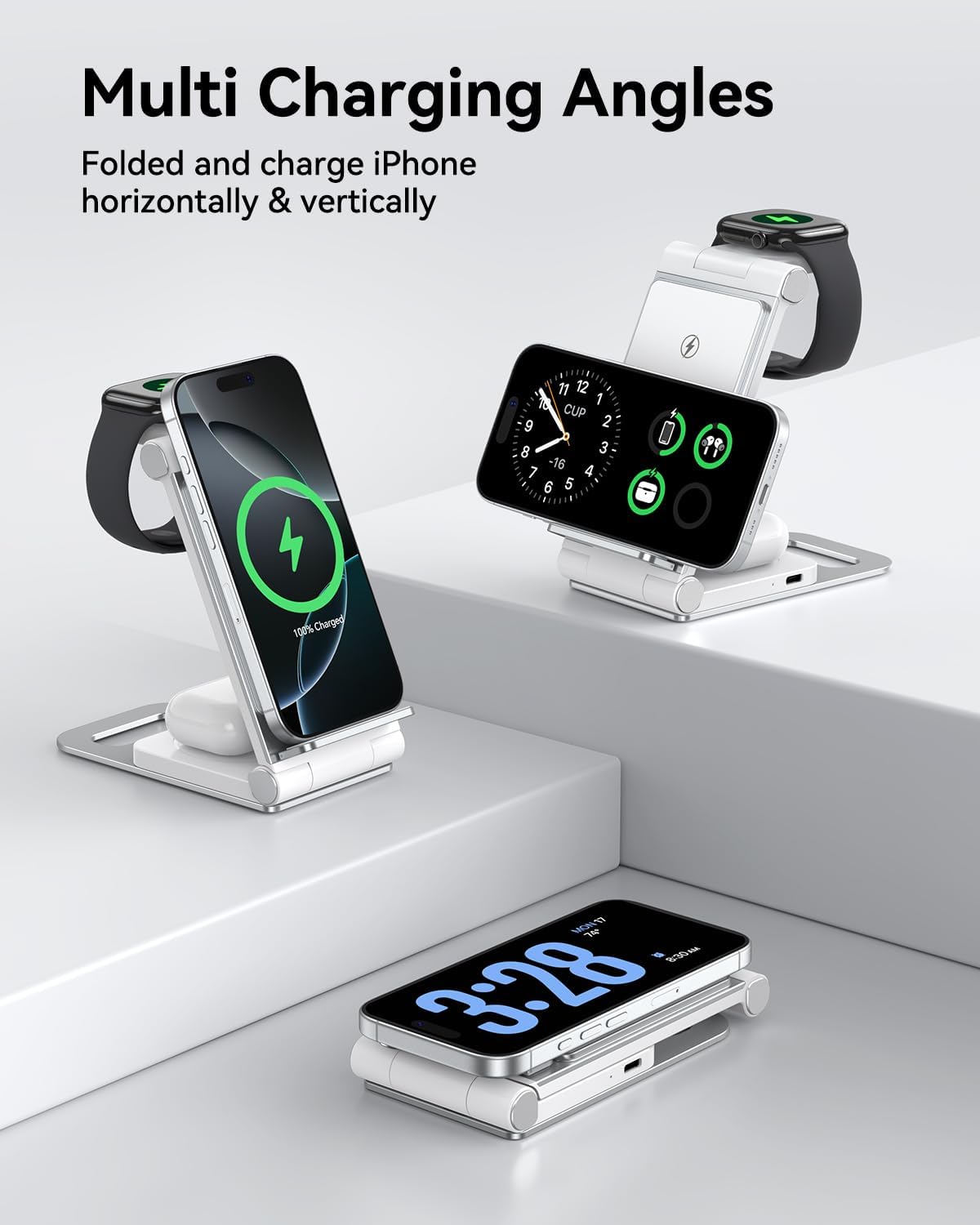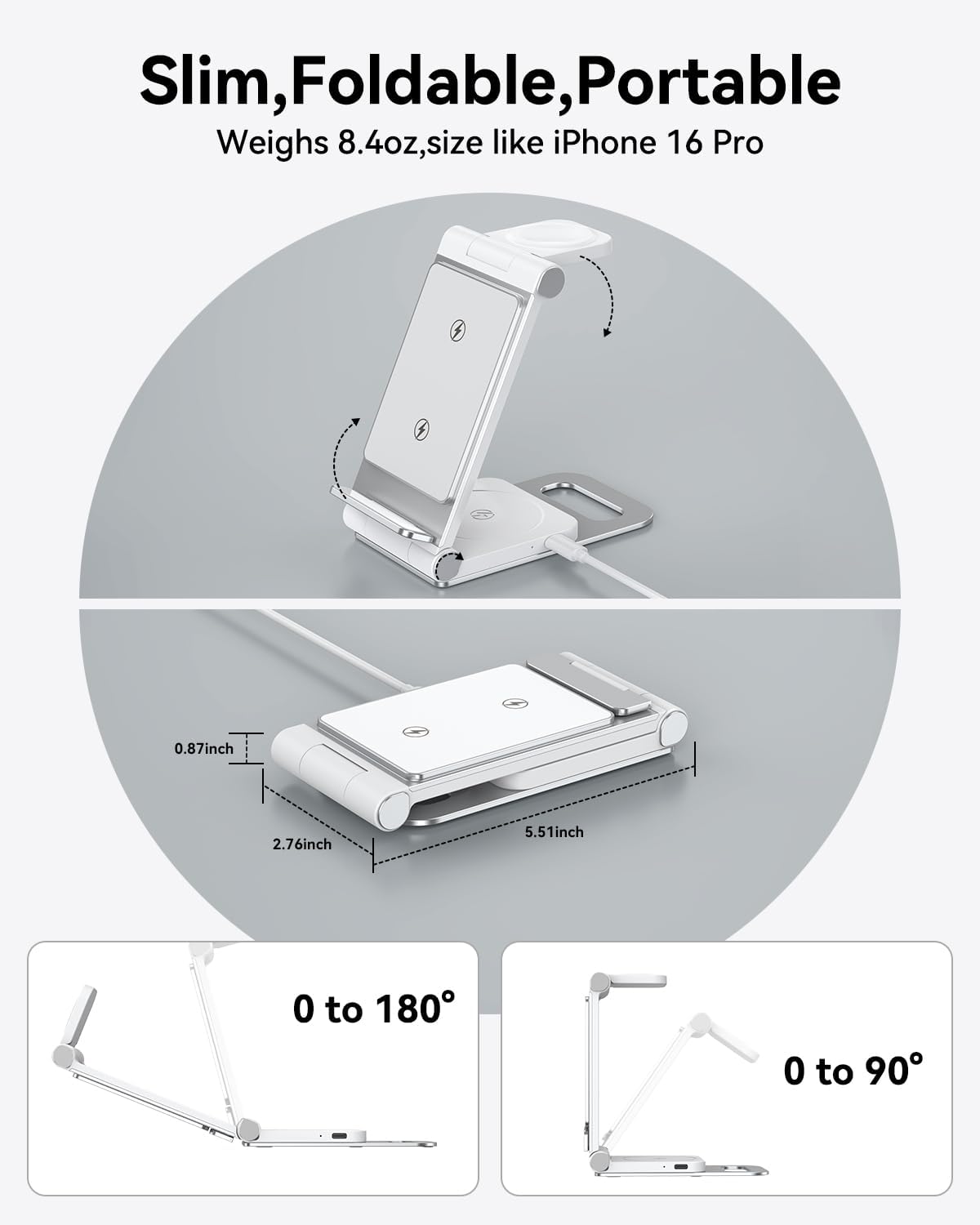 Складаний дизайн та портативність для подорожей: цю зарядну станцію 3 в 1 можна легко скласти на 180° у бездротову зарядну панель, вона невелика та не громіздка, її можна покласти в сумку або валізу. Ця бездротова зарядна станція підійде не лише для дому, офісу та ділової поїздки. Візьміть із собою зарядний пристрій 3-в-1, який може заряджати кілька пристроїв одночасно. Також він універсальний як підставка для мобільного телефону з регулюванням кута.