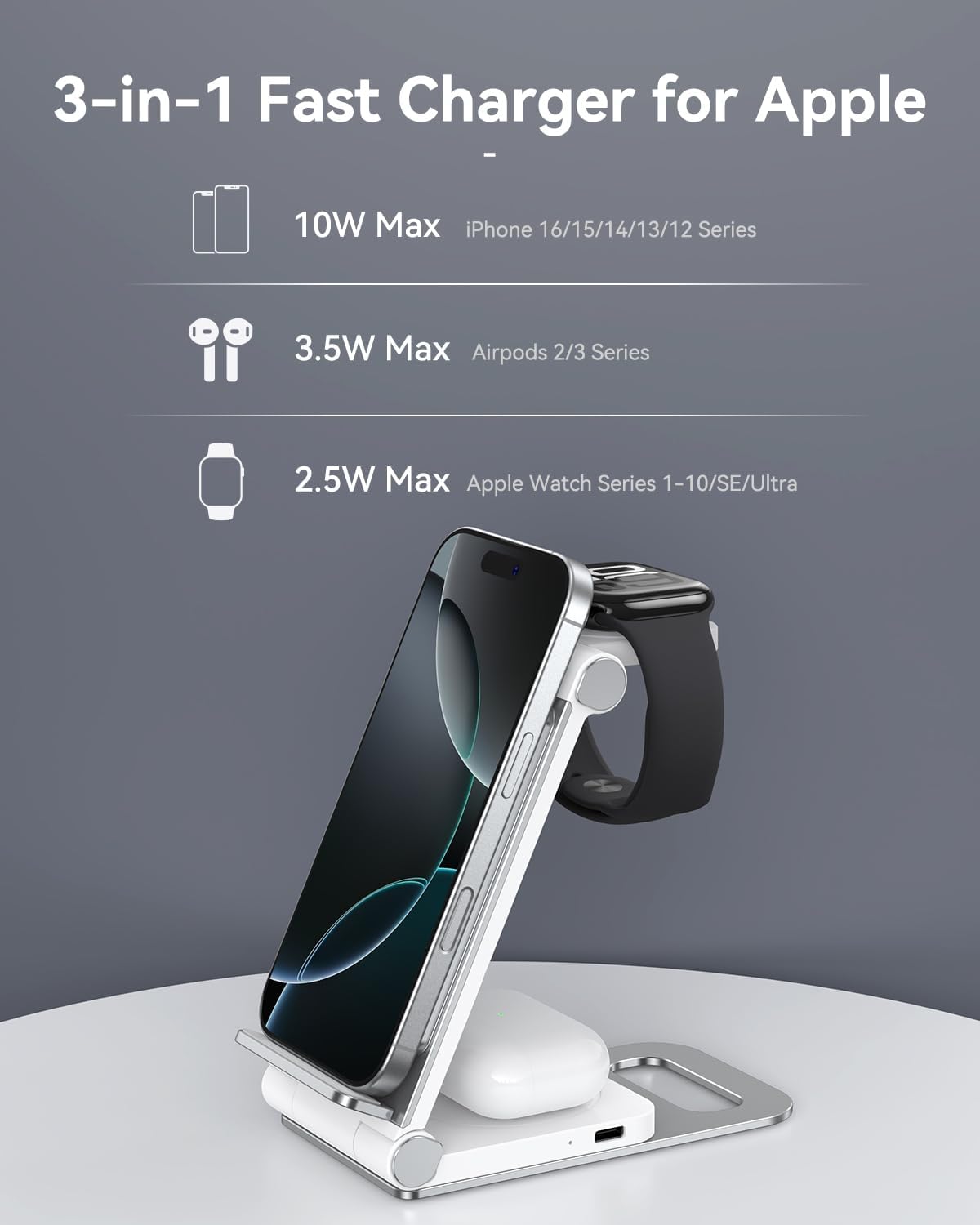 Бездротовий зарядний пристрій 3 в 1: ця бездротова зарядна станція підтримує швидку зарядку для кількох пристроїв Apple, зокрема для iPhone 16, 15, 14, 13, 12, 11 Pro, Pro Max SE/XR/X/XS/XS Max 8 Plus. Магнітний бездротовий зарядний пристрій для Apple Watch 10, 9, 8, 7, 6, 5, 4 SE та бездротову зарядку для Airpods 3/2 Pro. Попрощайтеся з окремими зарядними пристроями.