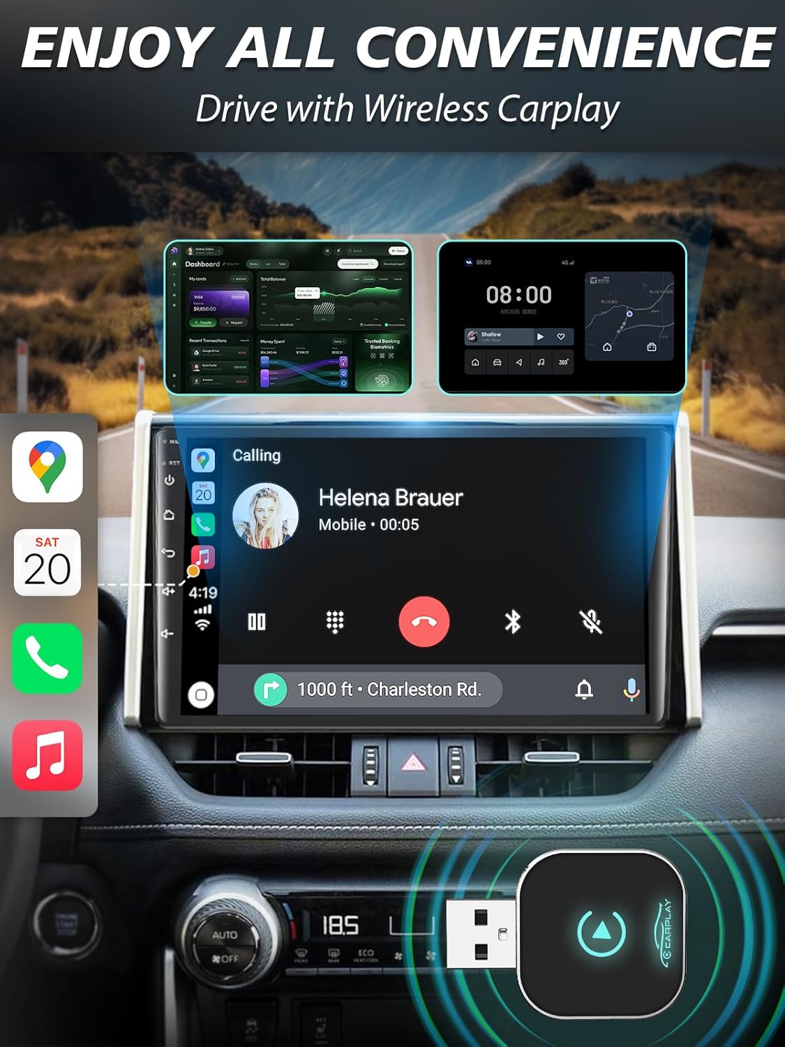 Будьте в курсі подій: легко оновіть свою дротову систему CarPlay до бездротової! Блок CarPlay керує всім одним словом, дотиком або поворотом. Заощадьте 40% часу завдяки швидкому автоматичному підключенню та безперебійній роботі, наприклад, навігація, відтворення музики, помічник Siri, телефонні дзвінки, радіо тощо. (Примітка: Наш CarPlay сумісний лише з дротовими автомобільними системами CarPlay.)