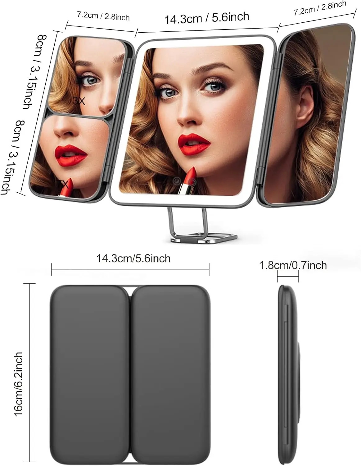 Світлодіодне дорожне дзеркало повністю складається з максимальним кутом відкриття 180°. Дзеркало з відкидною підставкою, міцна підставка та легке розміщення.