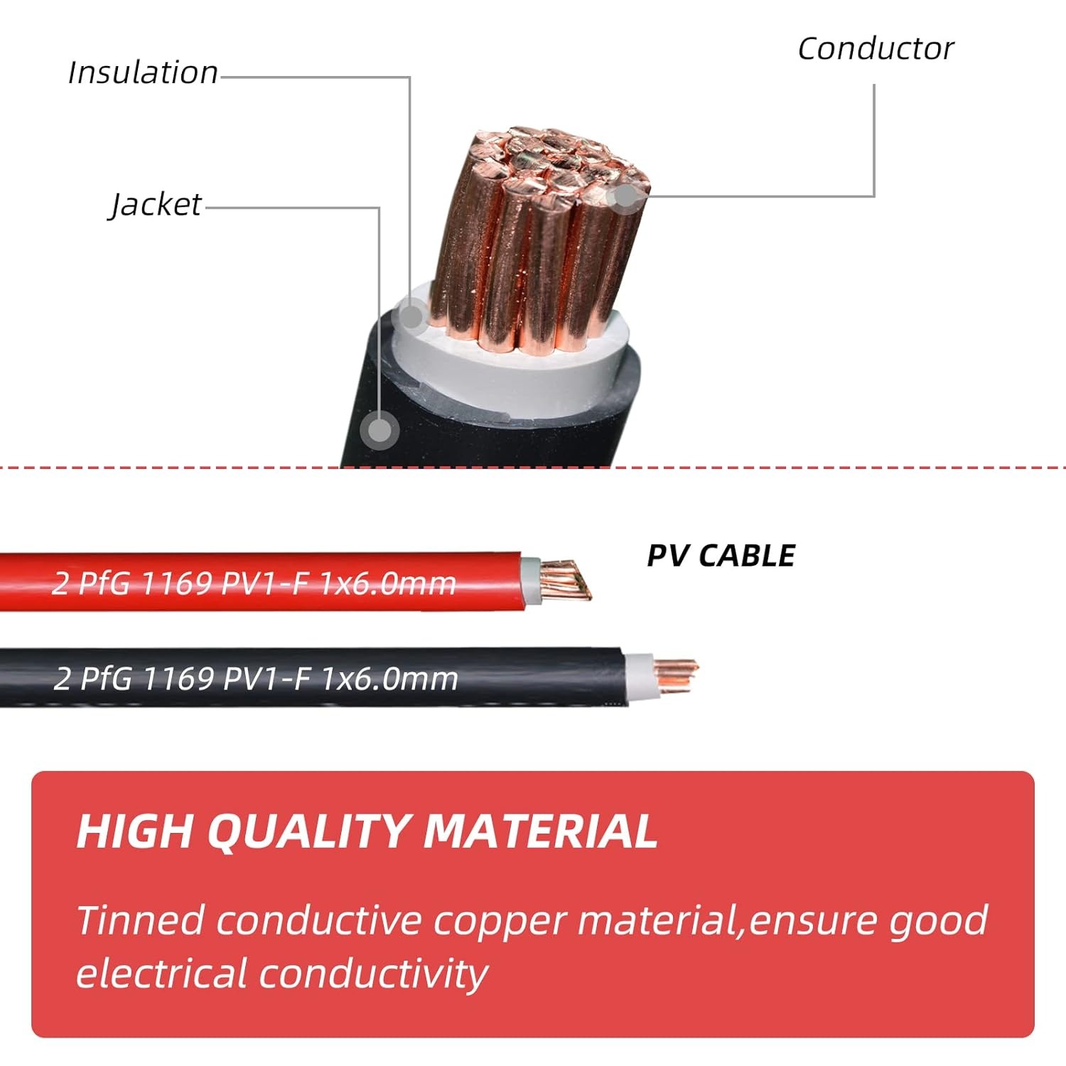 провідники виготовлені з лудженої міді, роз’єми виготовлені з PPO, а кабелі виготовлені з XLPE. Хороший контактний матеріал забезпечує стабільну передачу. Зовнішня ізоляція має чудову стійкість до старіння та ультрафіолетового випромінювання, стійкість до високих температур, стійкість до стирання та корозії.
