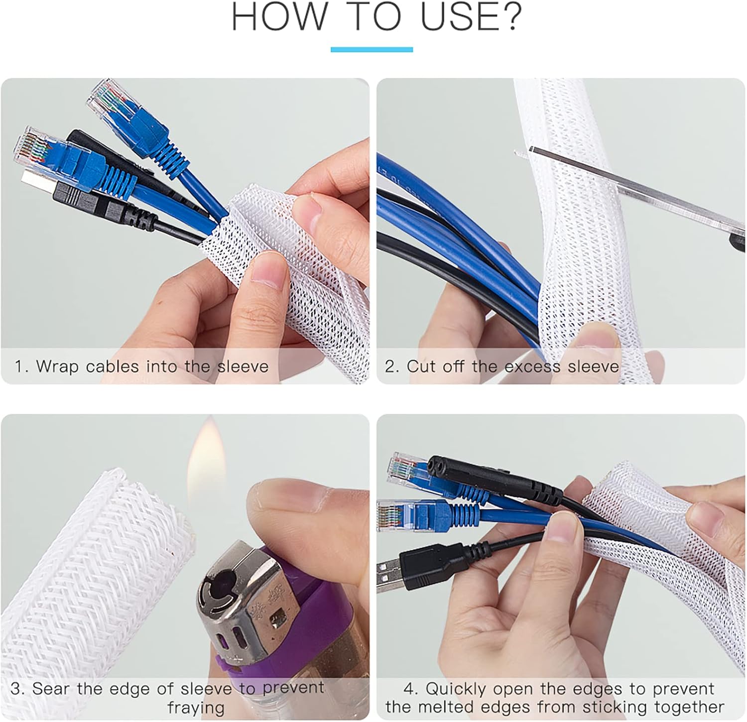 Наша кабельна оболонка адаптується до ваших потреб. Шланг легко регулюється до потрібної довжини за допомогою ножиць та утримує різні кабелі. Злегка з'єднайте кінці запальничкою, щоб нічого не пошкодилося.