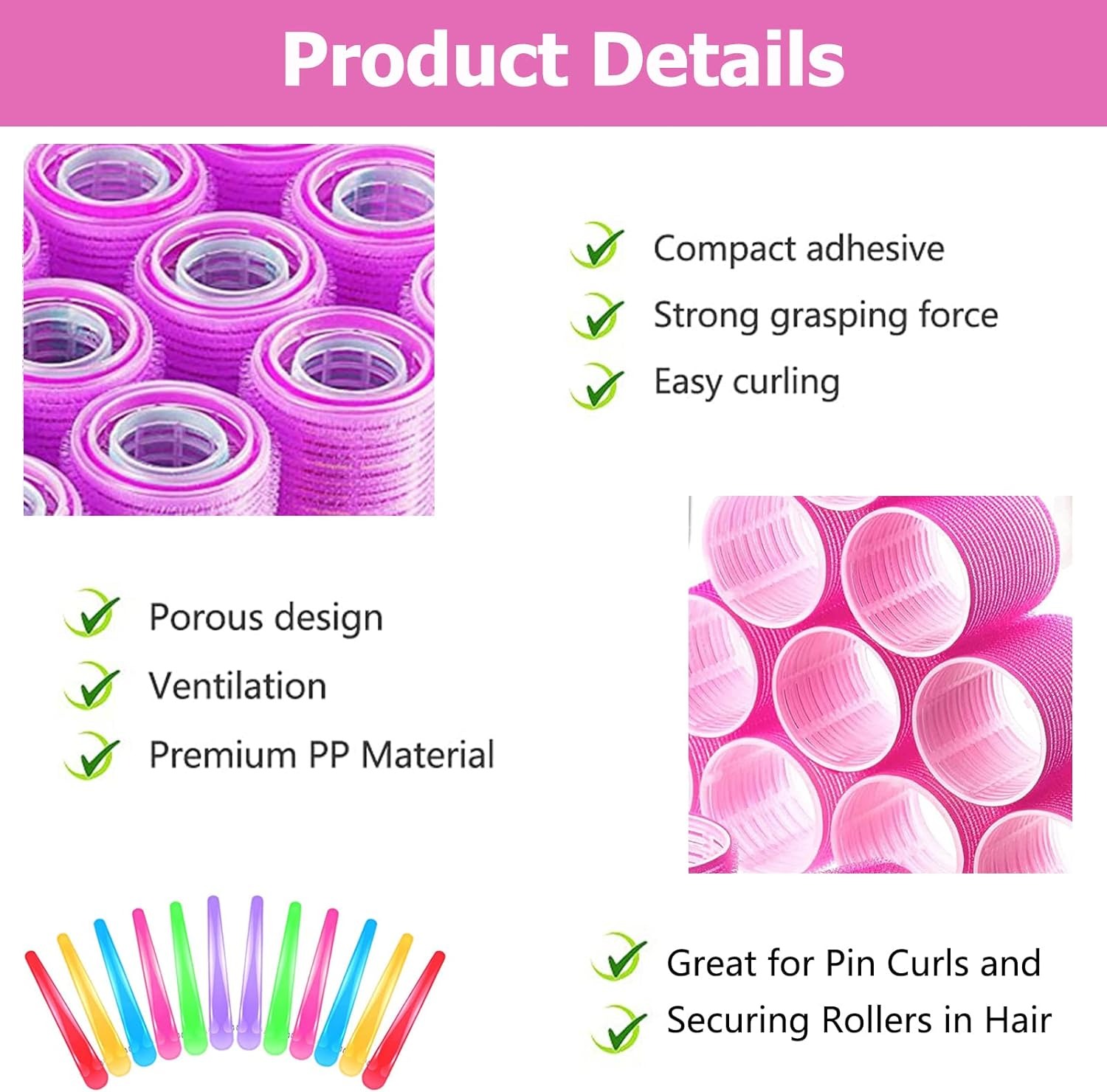 До складу валиків для волосся входять 18 валиків і 12 затискачів із качкодзьоба з нержавіючої сталі. Щипці для волосся можуть добре підтримувати еластичність і блиск волосся.