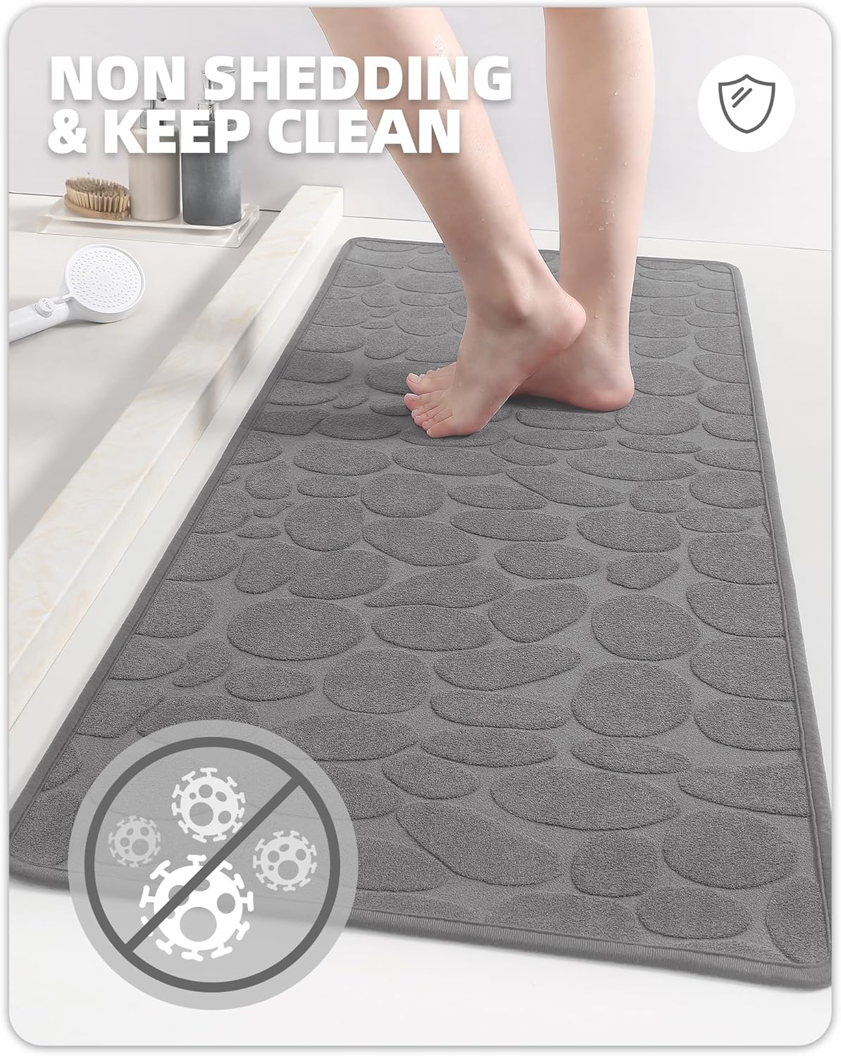 Порівняно з м'якими килимами для ванни, які завжди збирають волосся, пух і сміття, цей килимок для ванни з коротким ворсом не линяє і набагато легше чиститься. Якщо килимок забрудниться, його можна пропилососити, промити під душем або просто закинути в пральну машину для швидкого та легкого чищення.