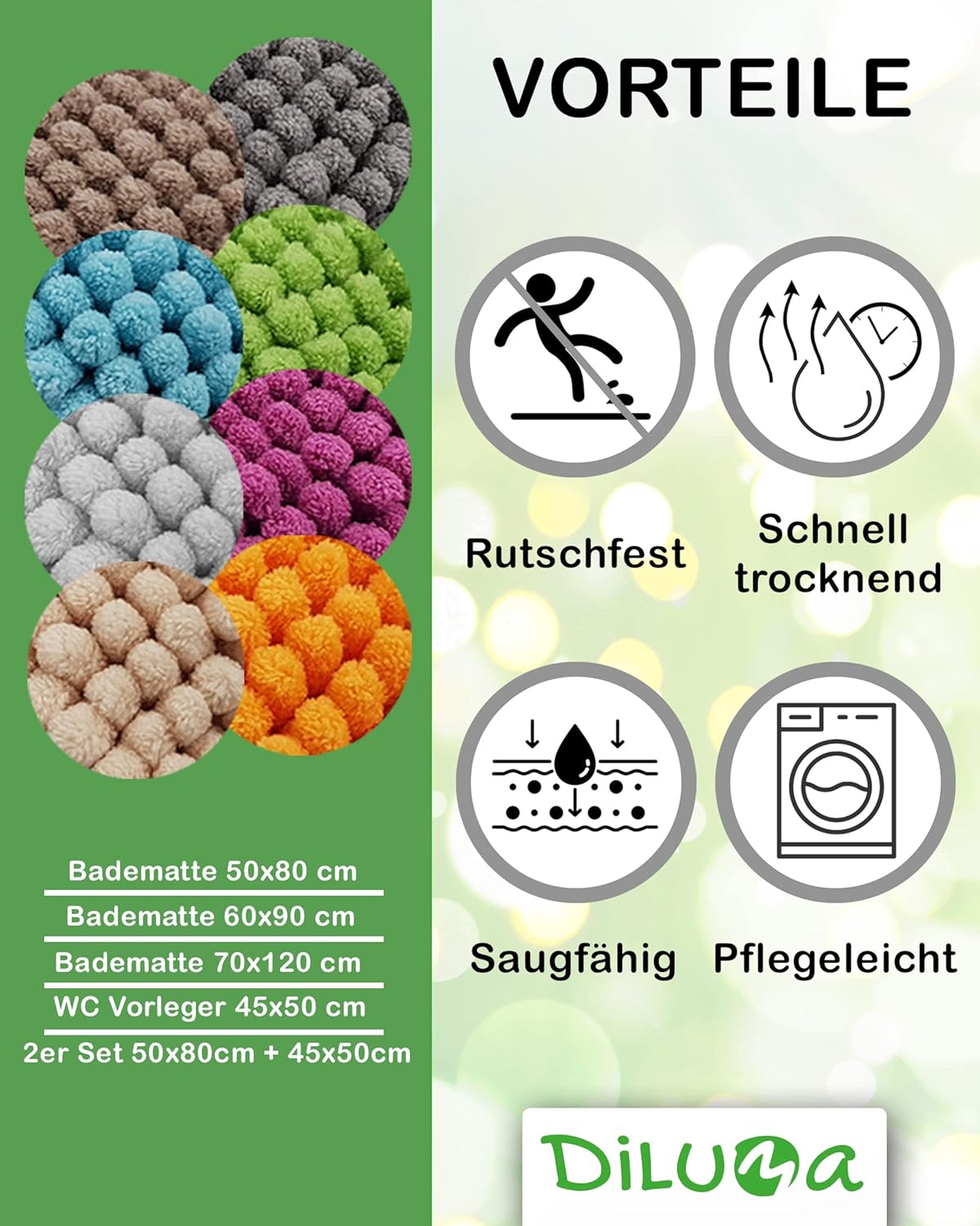 Вони довговічні та підходять для приміщень з підігрівом підлоги. Звичайно, наші килимки для ванної кімнати протестовані на наявність шкідливих речовин відповідно до стандарту Oeko-Tex Standard 100.