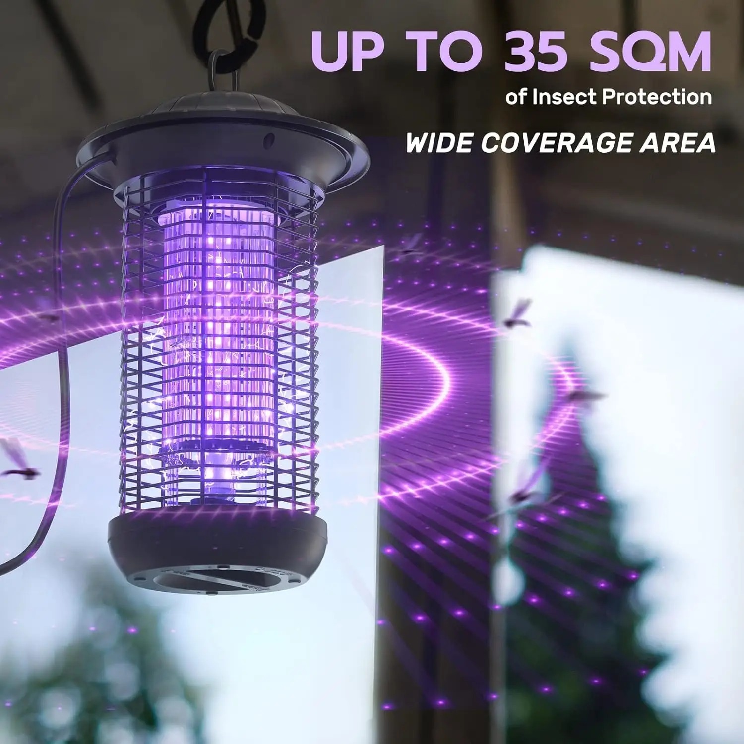 Лампа для знищення комарів містить ультрафіолетове світло високої інтенсивності 18 Вт, яке може ефективно приваблювати комарів та інших шкідливих літаючих комах, випромінюючи довжину хвилі 365 нм і 360 °, а потім знищувати їх куполом напругою 4000 В. Він може ефективно охопити площу понад 90 квадратних метрів.