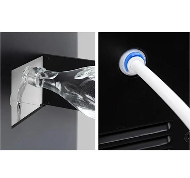 Вода в льодогенератор подається вручну або шляхом приєднання до крана з допомогою доданого шланга. Льодогенератор повідомляє, коли відро для льоду заповнено або рівень води дуже низький. Сучасний дизайн машини для льоду вписується в будь-яку обстановку.