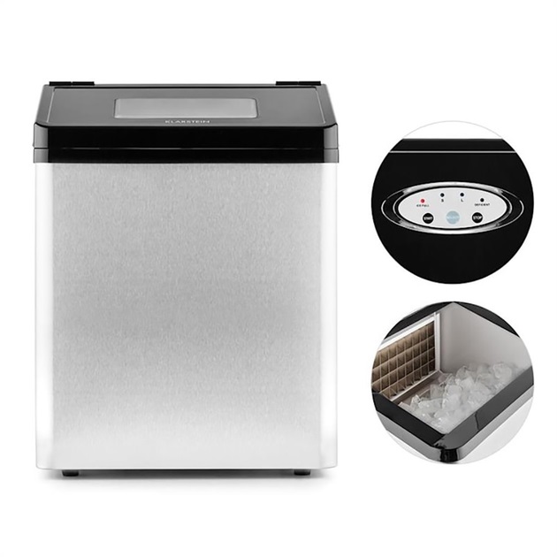 Завдяки простому корпусу з облицюванням з нержавіючої сталі машина для приготування кубиків льоду Klarstein також може бути легко інтегрована в існуючий бар або кухню. Їхня висока продуктивність робить їх незамінним помічником при приготуванні великої кількості кубиків льоду.