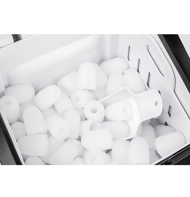 регульований розмір кубика льоду: S, L Холодоагент: R134a Кліматичний клас: T малошумний високопродуктивний компресор проста для розуміння панель управління з 3 кнопками та світлодіодами стану похилий жолоб для легкого зняття ковзані ніжки Електроживлення: 220-240 В змінного струму ~ 50 Гц 38 x 49,5 x 41 см (ШхВхГ) Відстань: не менше 15 см (збоку/ззаду) Довжина кабелю: прибл. 1,35 м Вага: близько 22 кг