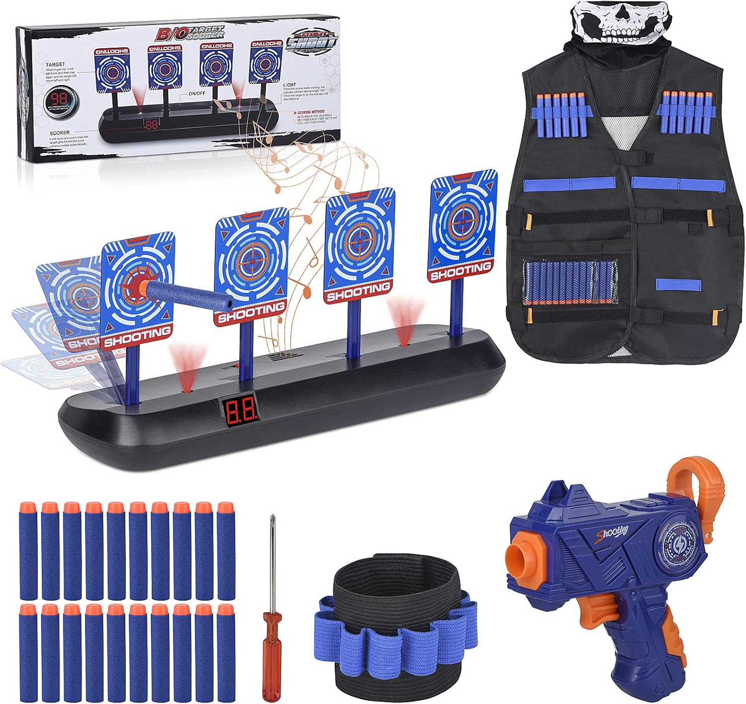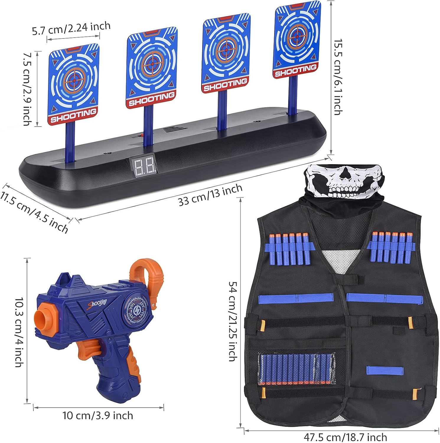 Набір мішеней: в комплект входить 1 електрична мішень, 1 дитячий іграшковий пістолет, 1 тактичний жилет, 1 безшовна маска і 1 ремінець для дротиків і 20 дротиків.