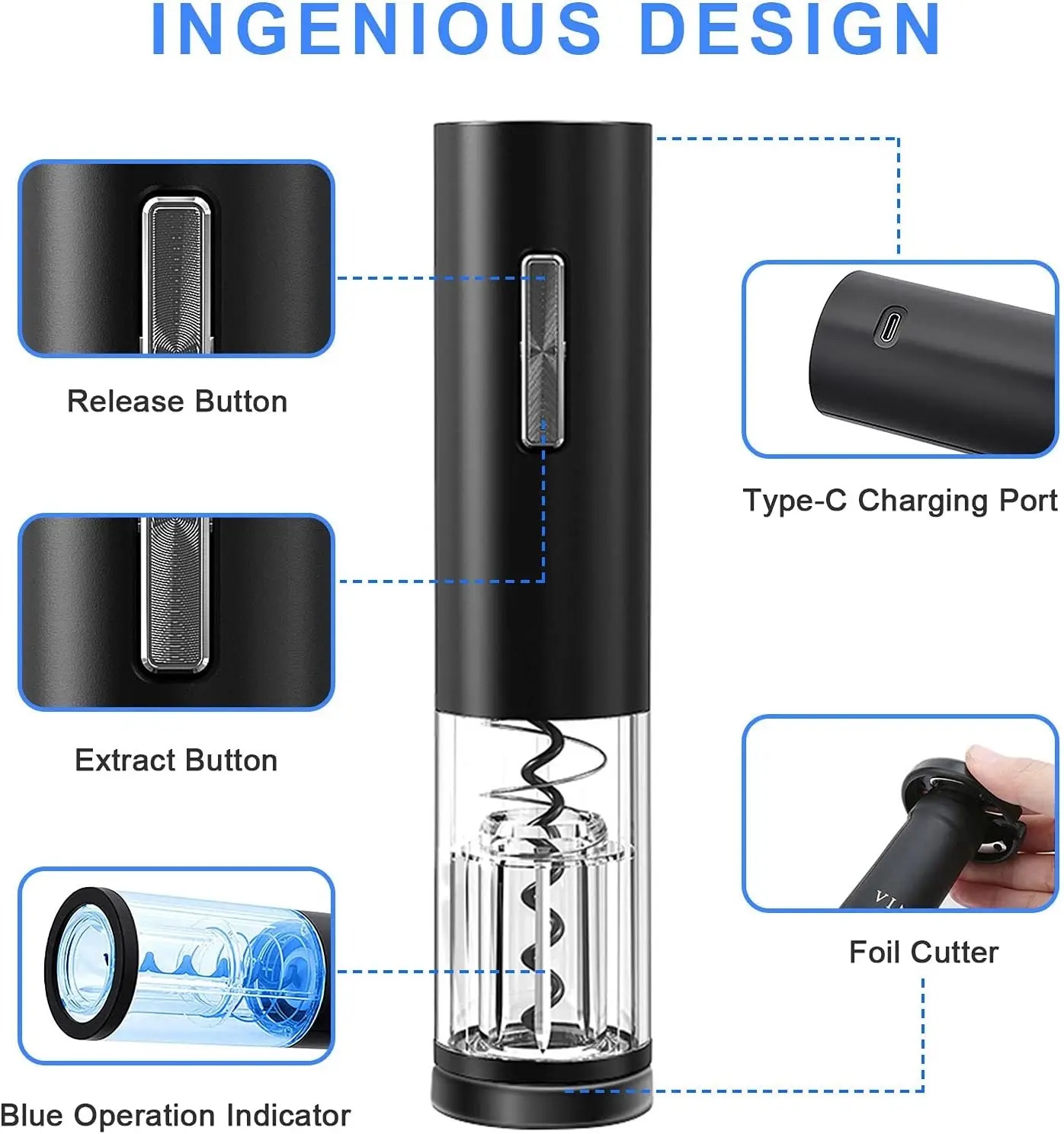 Геніальний дизайн: електрична відкривачка для вина Dodiff виготовлена з ABS PC, щоб забезпечити тривале безпечне використання. Прозора оболонка та синій індикатор роботи допоможуть легко вийняти пробку. Різак фольги базового типу простий у зберіганні та використанні.