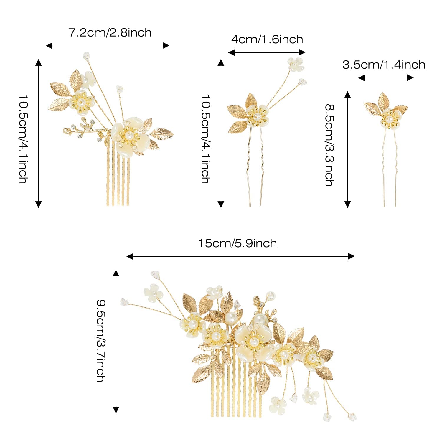 У комплект входить 27 весільних золотих аксесуарів для волосся (5 квіткових гребенів для волосся + 22 U-подібних перлинних шпильки для волосся), різні форми та стилі відповідають вашим потребам у укладанні волосся.