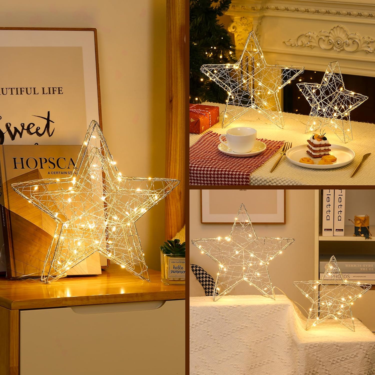Декоративні різдвяні зірки виготовлені з високоякісного кованого заліза, міцного та стійкого до іржі. Високоякісний залізний дріт та маленькі світлодіодні намистини створюють гарне нічне світло. Настільна світлодіодна лампа ідеально впишеться у будь-який інтер'єр.