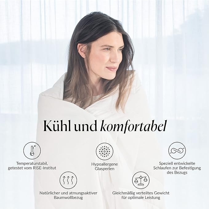 вологовідвідний наповнювач і зовнішній гіпоалергенний бавовняний шар запобігають нічному потовиділенню та зберігають приємну температуру (сертифіковано Інститутом RISE). Крихітні скляні намистини, рівномірно вшиті всередину обважненої ковдри, роблять ковдру важкою.