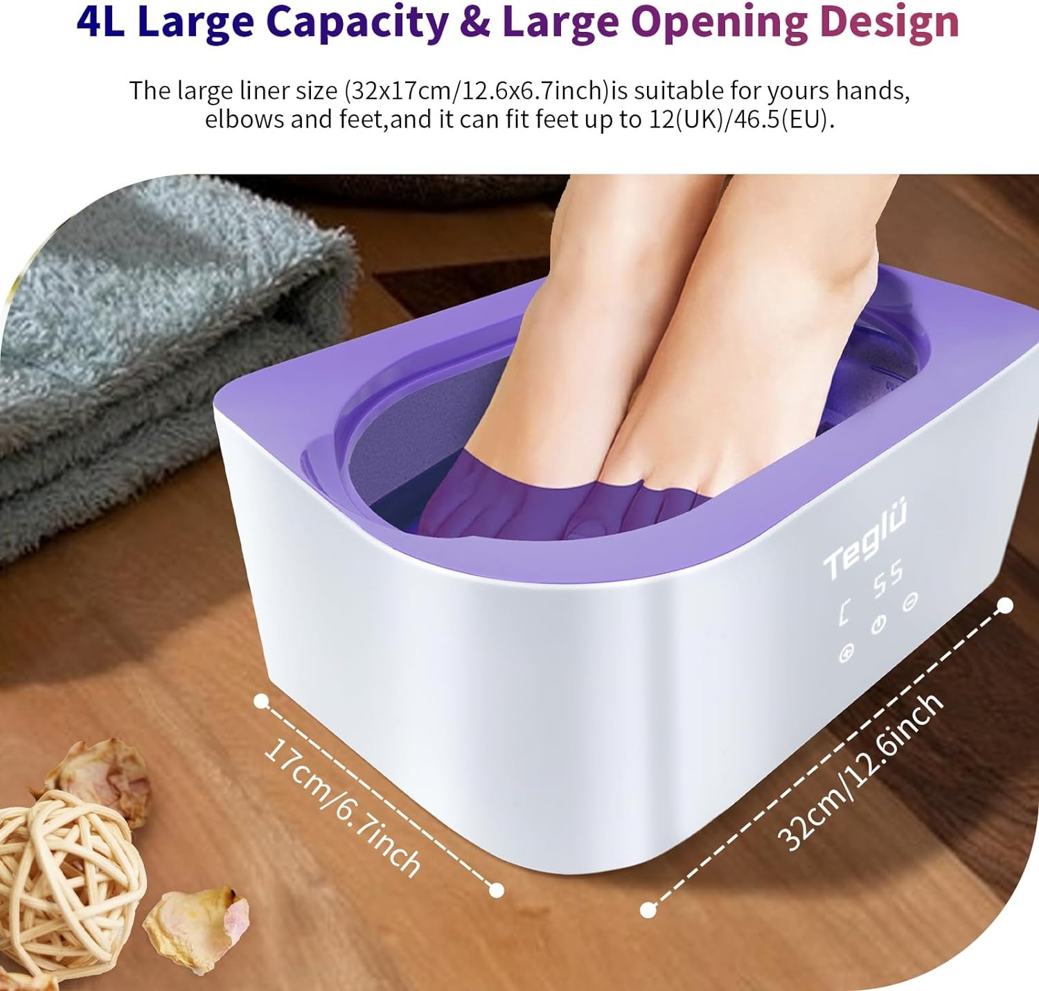 Велика ємність для рук і ніг: наша електрична парафінова ванна об’ємом 4000 мл має великий внутрішній резервуар розміром 32×17 см, що забезпечує достатньо місця для замочування рук, ліктів або ніг (максимальний розмір взуття 47).