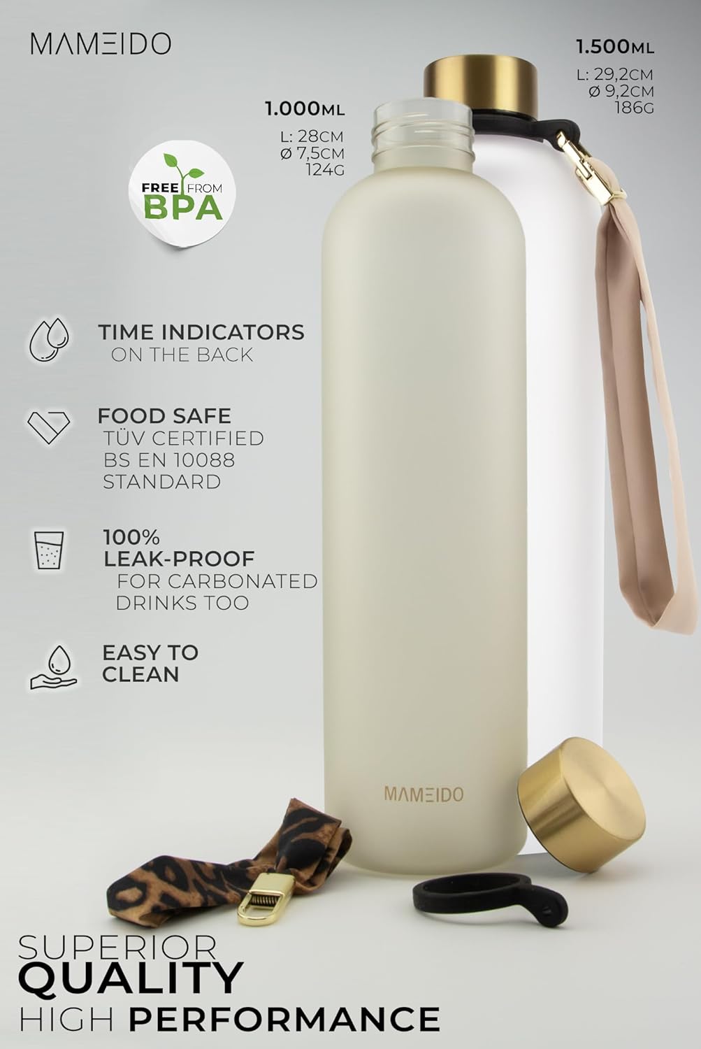 Компоненти в комплекті: Подарункова коробка з ефектом відлущування, Вишукана гвинтова кришка, Модний ремінець з тримачем, Пляшка для води Tritan 1,0 л