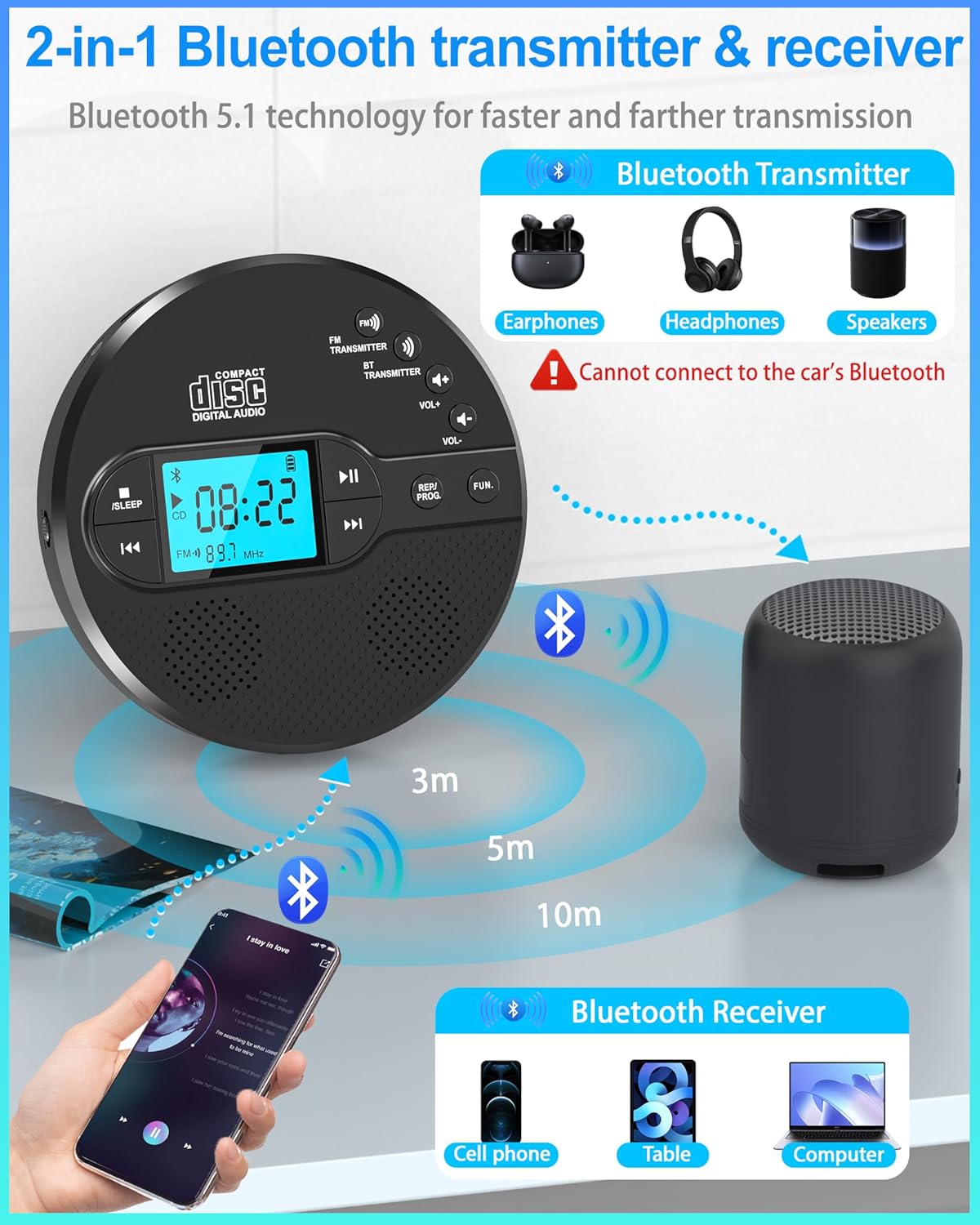 Портативний CD-програвач з Bluetooth 5.1: Портативний CD-програвач використовує нову технологію Bluetooth 5.1 та підтримує двостороннє бездротове з'єднання, яке можна використовувати як передавач сигналу для підключення до Bluetooth-колонок та навушників, як підсилювач приймача для підключення до телефону, iPad та ноутбука. ПРИМІТКА: Під час використання Bluetooth-передавача переконайтеся, що підключений пристрій Bluetooth не підключено до іншого пристрою. Функція Bluetooth-передавача не підтримує підключення до автомобіля.