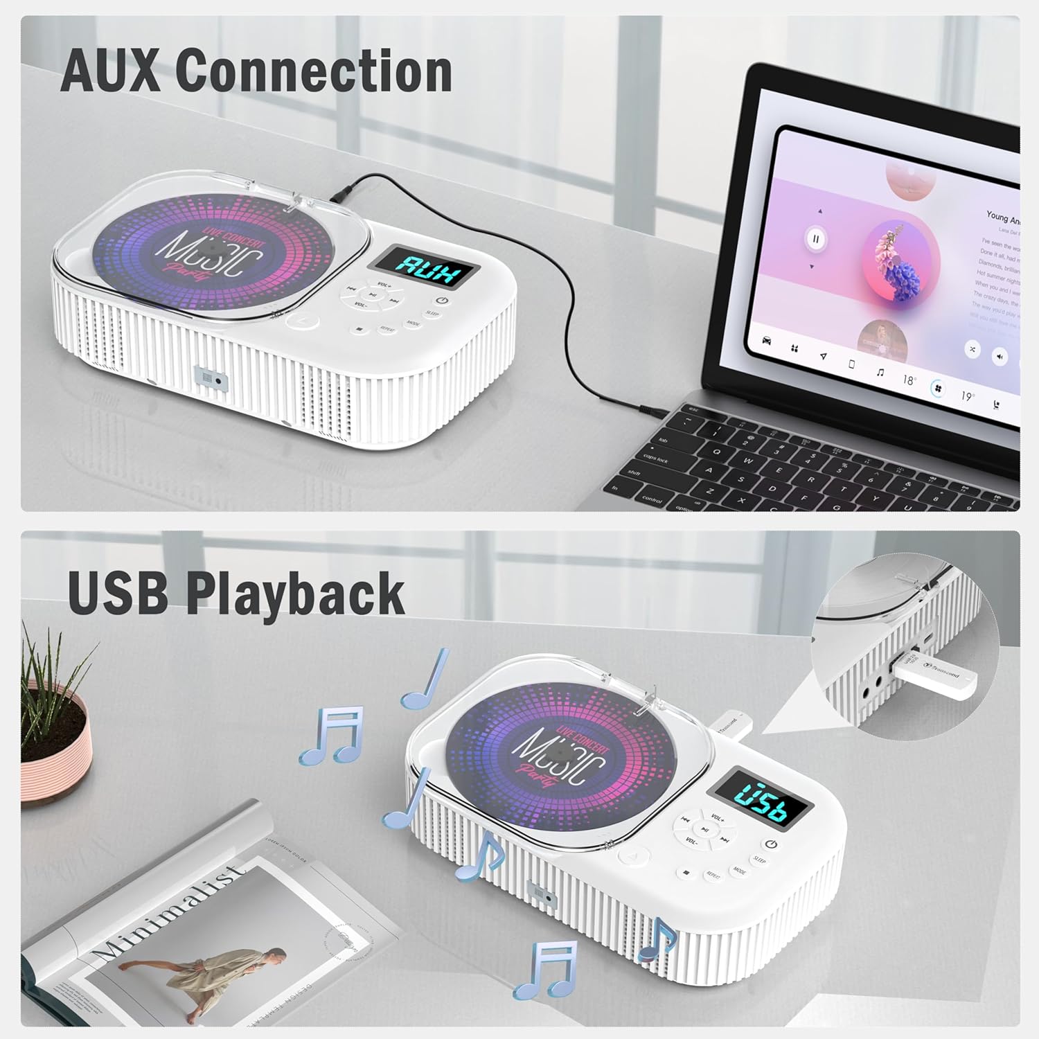 Цей CD-програвач для дому завдяки багатофункціональному дизайну може використовуватися як портативний CD-програвач, Bluetooth-колонка, FM-радіо, Bluetooth-передавач, USB-флеш-накопичувач та AUX-програвач. Він підтримує різні аудіоформати, включаючи аудіоCD, CD-R, CD-RW, USB: MP3, WMA, CDDA, MPEG-1/2.