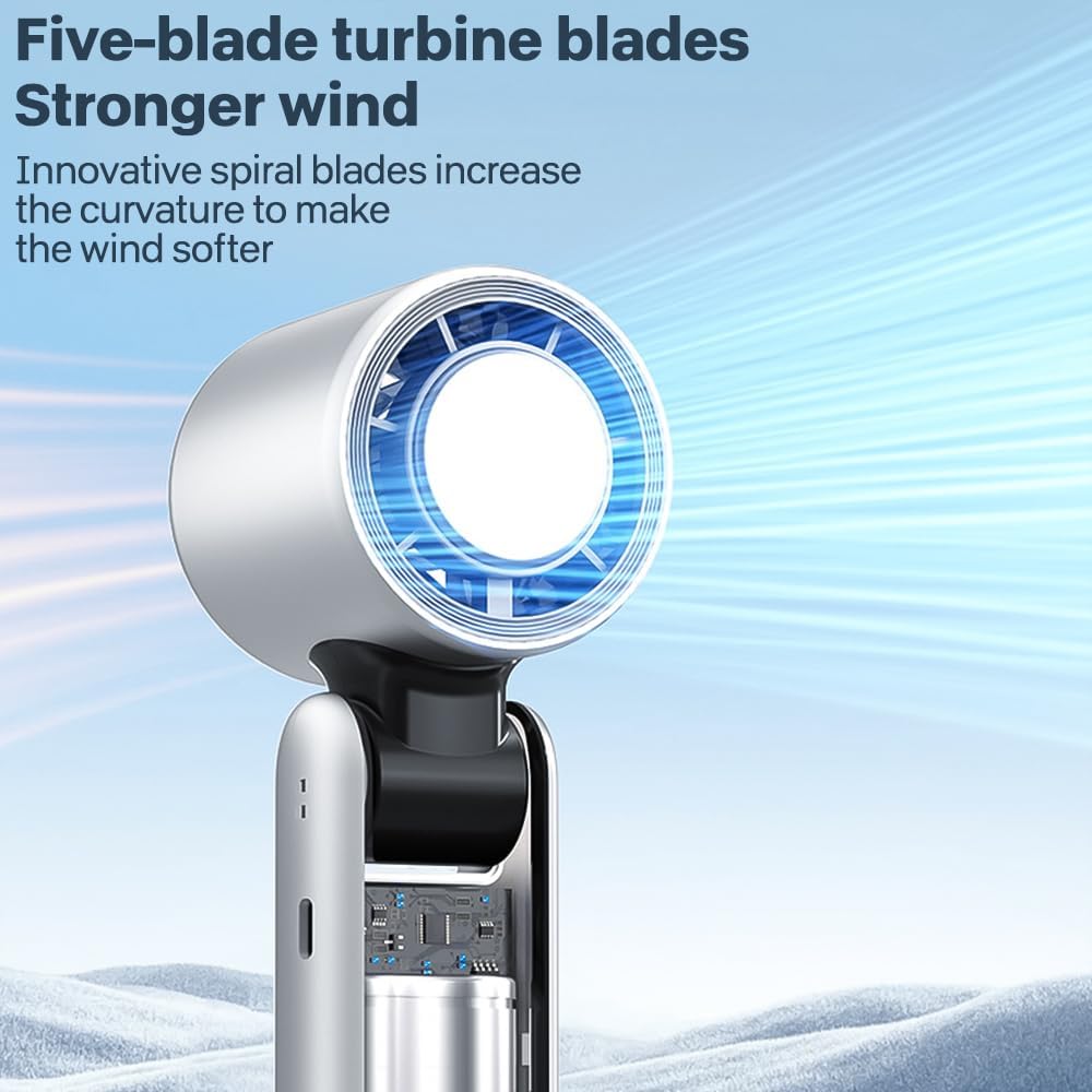 Удосконалений трифазний двигун забезпечує потужний потік повітря зі швидкістю до 10 м/с для миттєвого охолодження за будь-яких умов. Продумана конструкція «3 в 1» дозволяє використовувати його як ручний вентилятор, розміщувати на столі як настільний або носити на шиї за допомогою шнурка, що додається, для охолодження без допомоги рук. Міні-складний настільний вентилятор можна скласти на 180 ° під будь-яким кутом.