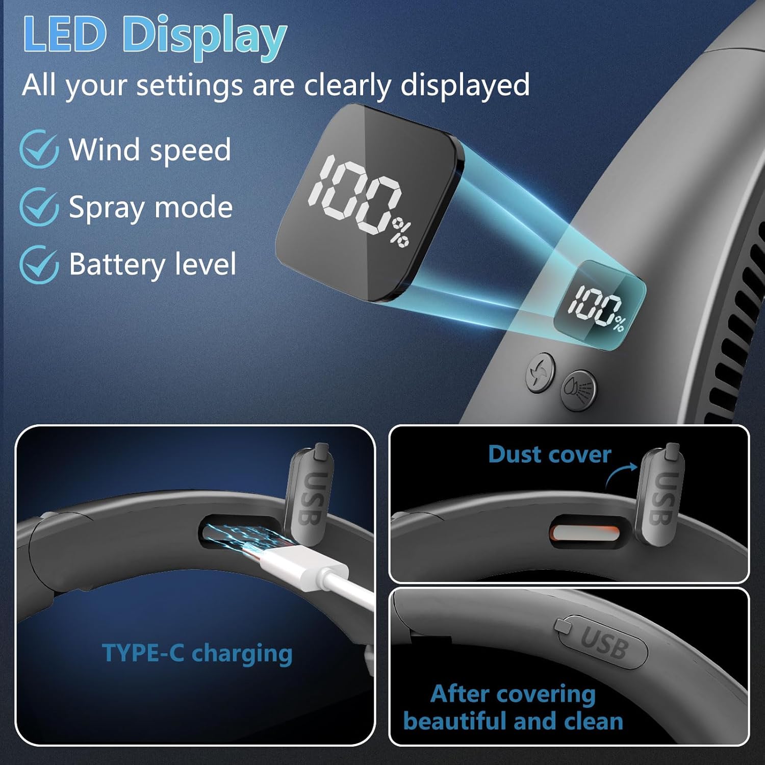 Портативний шийний вентилятор з акумулятором оснащений цифровим світлодіодним дисплеєм, який відображає швидкість вітру, режим розпилення та заряд акумулятора в режимі реального часу. Він показує рівень заряду акумулятора у вигляді числа, дозволяючи вам розумно регулювати час використання та заряджання персонального вентилятора. Наявність порту заряджання Type-C збільшує пилозахисний чохол USB, що забезпечує кращий захист порту заряджання і робить його більш привабливим.