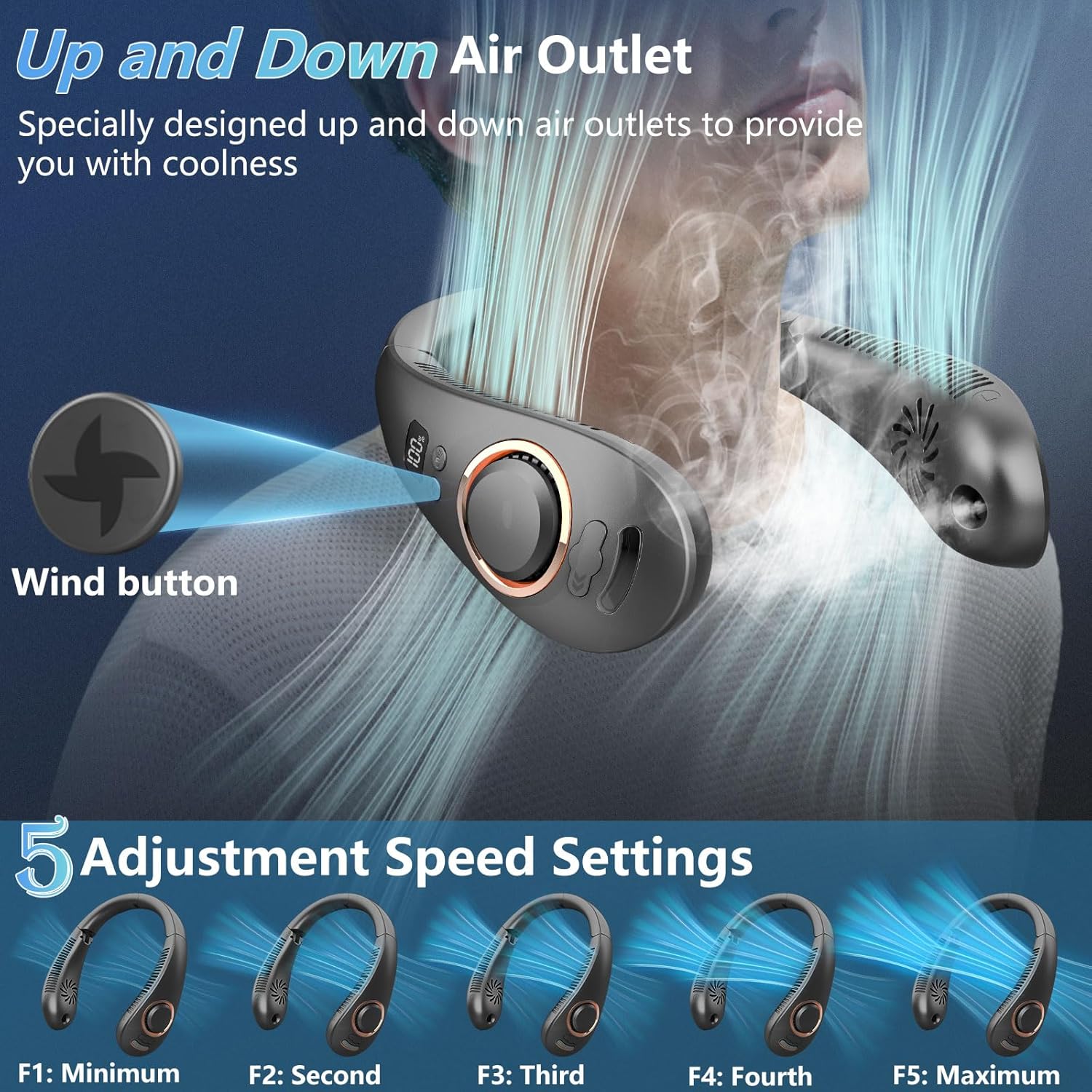 Шийні вентилятори KJXIC з інноваційною конструкцією верхніх і нижніх отворів повітрозабірних забезпечують не тільки обдув обличчя, але і охолоджують груди, забезпечуючи додаткову прохолоду. 5 швидкостей вентилятора дозволяють гнучко вибирати потрібну швидкість обдування для досягнення персоналізованого комфорту. 4000 мА · год. Тривалий час роботи акумулятора до 3–7 годин (залежно від швидкості та режиму розпилення). (незалежно)