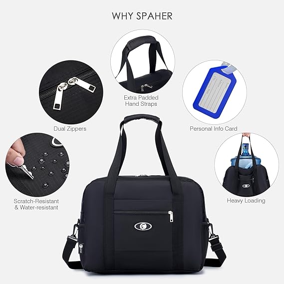 Розмір дорожньої сумки SPAHER складає 40x30x20 см, вона підходить для перевезення в літаку і для зберігання під сидіннями в літаках таких авіакомпаній, як Qatar Airways, TUI Airlines, Spirit Airline, Emirates Airline та ін. Вона легка і досить містка, щоб вмістити всі необхідні в подорожі телефонів або паперових серветок. У ній є картка з особистою інформацією, щоб ви могли легко знайти свій багаж.