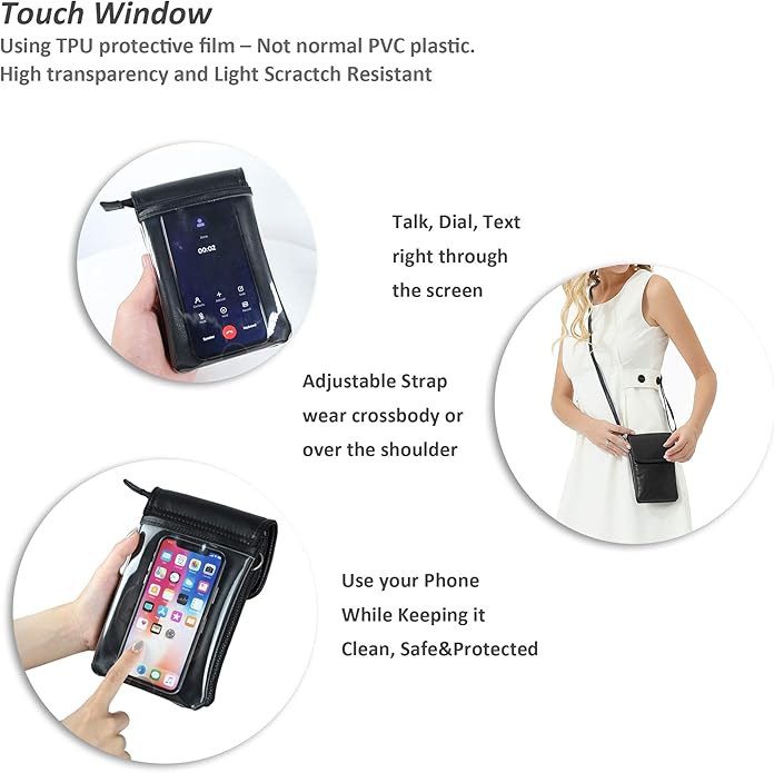 Сумка-чохол для мобільного телефону через плече befen із сенсорним екраном пропонує неймовірний спосіб миттєвого доступу до вашого телефону через сенсорне віконце! Високочутлива технологія Smart Touch Window дозволяє легко надсилати текстові повідомлення або переглядати веб-сторінки через прозоре захисне віконце.