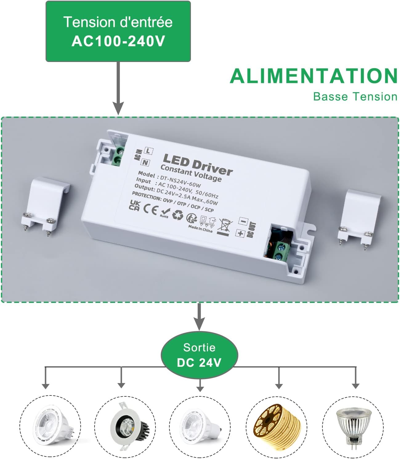 Трансформатор постійної напруги II класу для світлодіодів. Вхідна напруга змінного струму: 100-240 В, вихідна напруга постійного струму: 24 В, 50/60 Гц. (Не сумісний із світлодіодними лампами постійного струму).