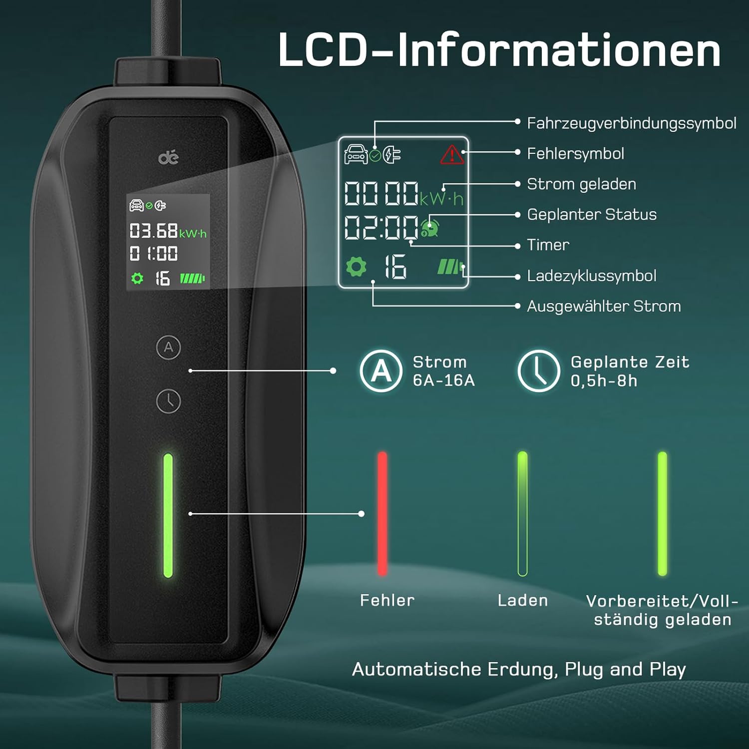 Довжина та функції: довжини 6 м достатньо для задоволення ваших повсякденних потреб. Ви можете легко перемикати потужність та заряджати свій автомобіль. Просто встановіть потужність вперше та активуйте функцію пам'яті автоматично.