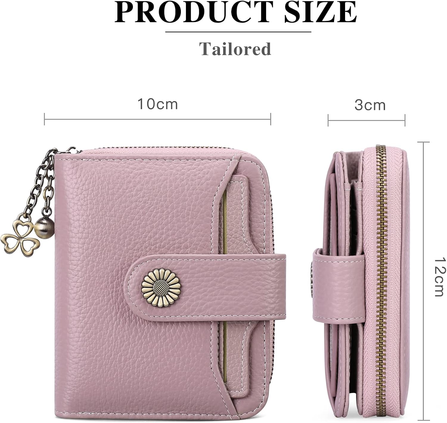 Цей гаманець виготовлений з високоякісної натуральної коров'ячої шкіри з вощеним оздобленням, прикрашений металевою застібкою-сонцем та вінтажною блискавкою. Зручна конструкція двох кнопок запобігає їх натисканню, коли вам потрібно покласти ще щось.