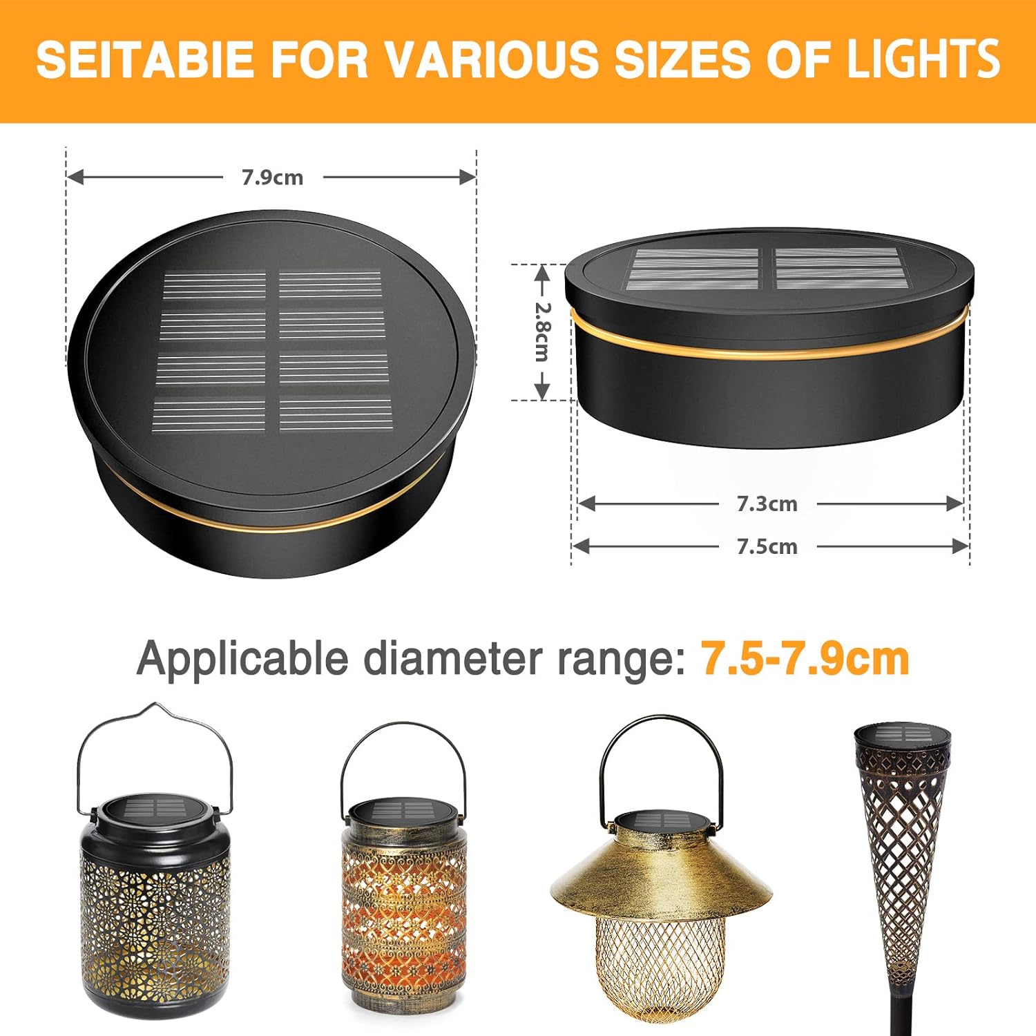 Змінна кришка діаметром 8 см теплого/білого кольору для сонячних ламп: змінні деталі для сонячних ламп мають діаметр 7,3-7,9 см і підходять для більшості вуличних садових світильників з діаметром отвору 7,5-7,9 см. Вбудований акумулятор ємністю 800 мА·год на 3.
